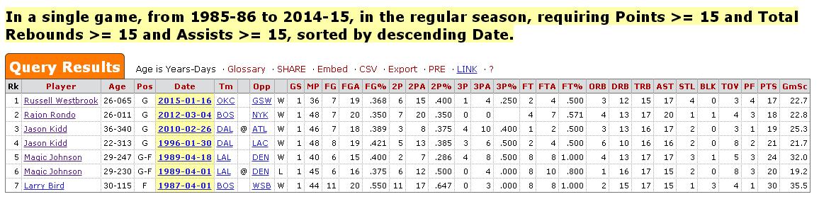 However, if one also factors in Russ’s 4 steals, you can then see that his achievemnt is truly unique – no player has ever managed to have at least 15 points, rebounds and assists, to go along with 4 steals. Fucking amazing! AND he did it in the least amount of minutes of all the gentelmen who are featured here – 36. You go Russ!