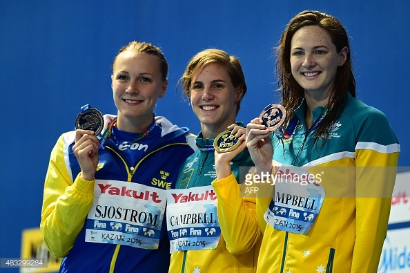 The evening started out with a bang. My personal favorite, Ranomi Kromowidjojo, had a bad start and was only 6th at the halfway point. She accelerated in the second half and recorded the second best second 50m, but it was only enough for 4th place overall. So no medal for Ranomi, the Olympic champion. I hoped that Sarah Sjostrom will get a medal as well, after her heroic swim in the relay yesterday. And indeed, she swam beautifully and had the fastest split of them all in the second 50m, which was enough for a silver medal. She squeezed in between the awesome Campbell sisters. Surprisingly it was the younger sister – Bronte, who won the gold in a time of 52.52. Cate, who strongly remind me of Sansa Stark, finished third to complete the podium. Two sisters on the podium! This was Bronte’s second gold here after the one in the 4*100m freestyle relay, and Cate had to settle for the bronze after winning the gold medal two years ago. BTW, they may be sisters but they really don’t look alike. Missy Franklin had a weak swim, but it was expected of her – she’s not a sprinter after all. She finished 7th. So after 5 swims Missy has 1 gold medal, two bronzes… and that’s it. What a downgrade from two years ago…